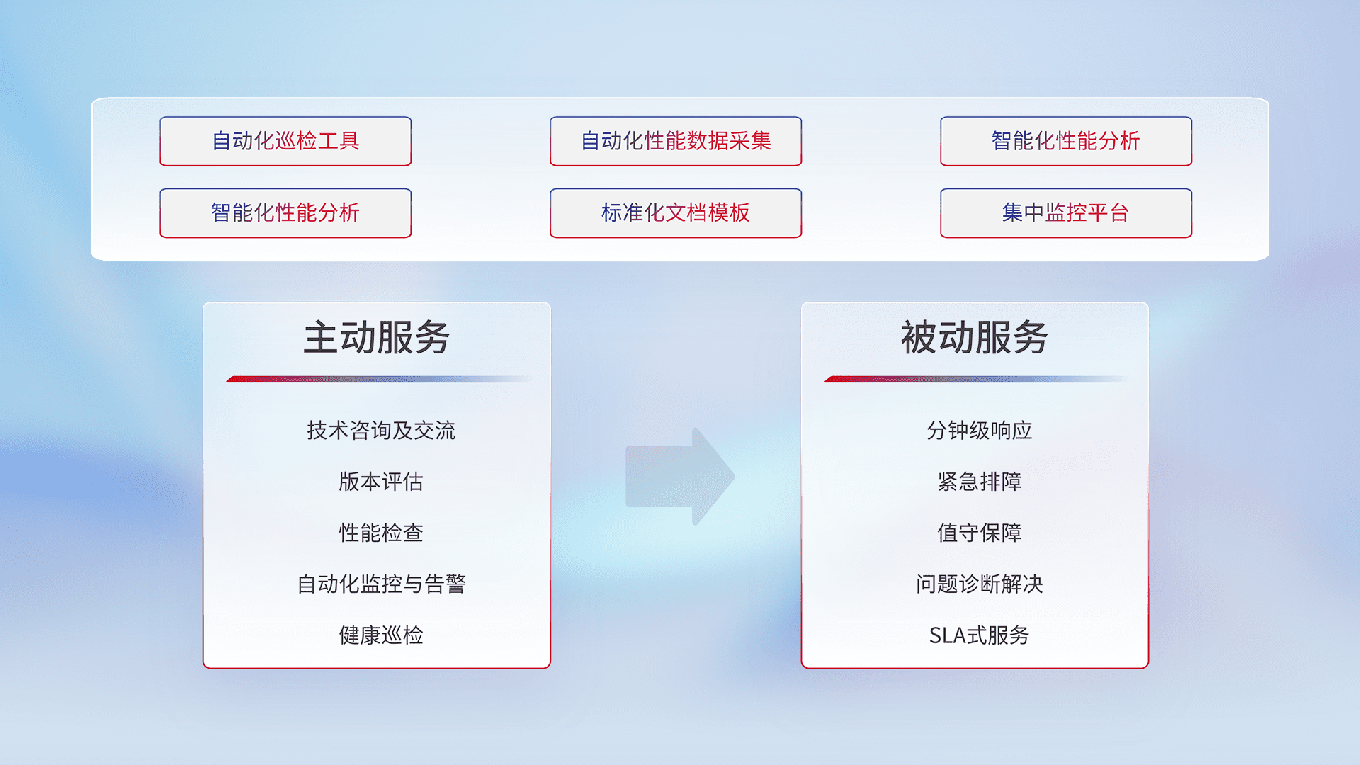 智能化工具和标准化文档,,,,保障服务质量,,,提供主动服务(包含技术咨询、、、版本评估、、、、性能检查、、、自动化监控与告警、、健康巡检)和被动服务包含(分钟级响应、、紧急排障、、、、值守保障、、、、问题诊断解决、、、、SLA服务)。。。